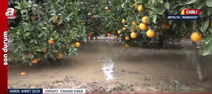 Tarım arazilerinden fazla suyun aktığı tahliye deresi taştı ve bölgedeki kamışlar söküldü. Tarım arazileri su altında kaldı. Zeytin ağaçları su altında kaldı ve üreticiler suyu tahliye etmeye çalıştı. Mandalina ve portakal bahçeleri çamurla kaplandı ve ayaklarımız balçığa batıyor. Manavgat bölgesine 116 kilogram yağış düştü.
