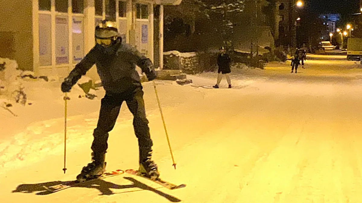 Ardahan'da kar yağışı hayatı olumsuz etkilerken, kar kalınlığının 22 santimetreye ulaştığı kent merkezinde cadde ve sokaklar kayak pistine döndü. Yeterli kar olmadığı için Yalnızçam Kayak Merkezi'ne gidemeyen bir grup genç, kent merkezinde kayak yaptı.