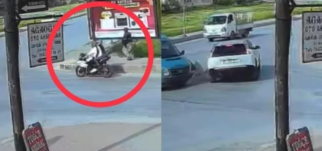 Feci kaza çevrede bulunan bir güvenlik kamerasına saniye saniye yansıdı. Görüntülerde iki aracın çarpışmasıyla savrulan otomobilin yayaya çarpma anları yer aldı. Görüntülerde kazadan saniyeler öncesinde ise aynı noktadan dönen 2 kişinin olduğu motosikletin de son anda kurtulması dikkat çekti.