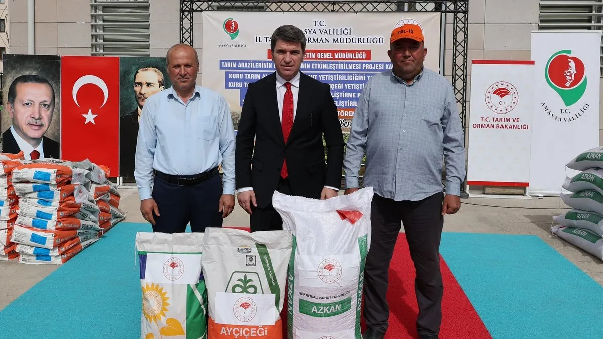Amasya'da, Tarım Arazilerinin Kullanımının Etkinleştirilmesi (TAKE) Projesi kapsamında, çiftçilere toplamda 13 milyon TL değerinde kuraklığa dayanıklı yağlık ayçiçeği ve nohut tohumu desteği sağlandı.