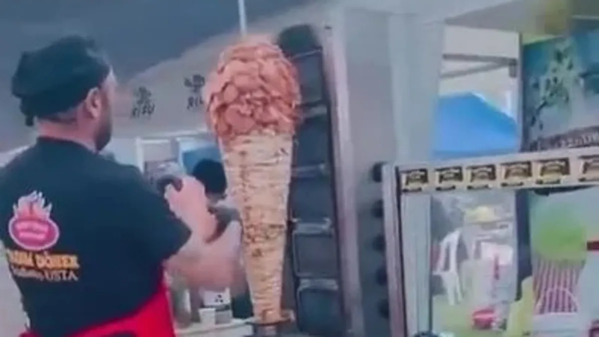 Dönercinin pişmiş döner üzerine çiğ et taktığı anlar böyle görüntülendi. (İHA)