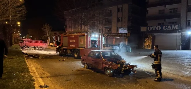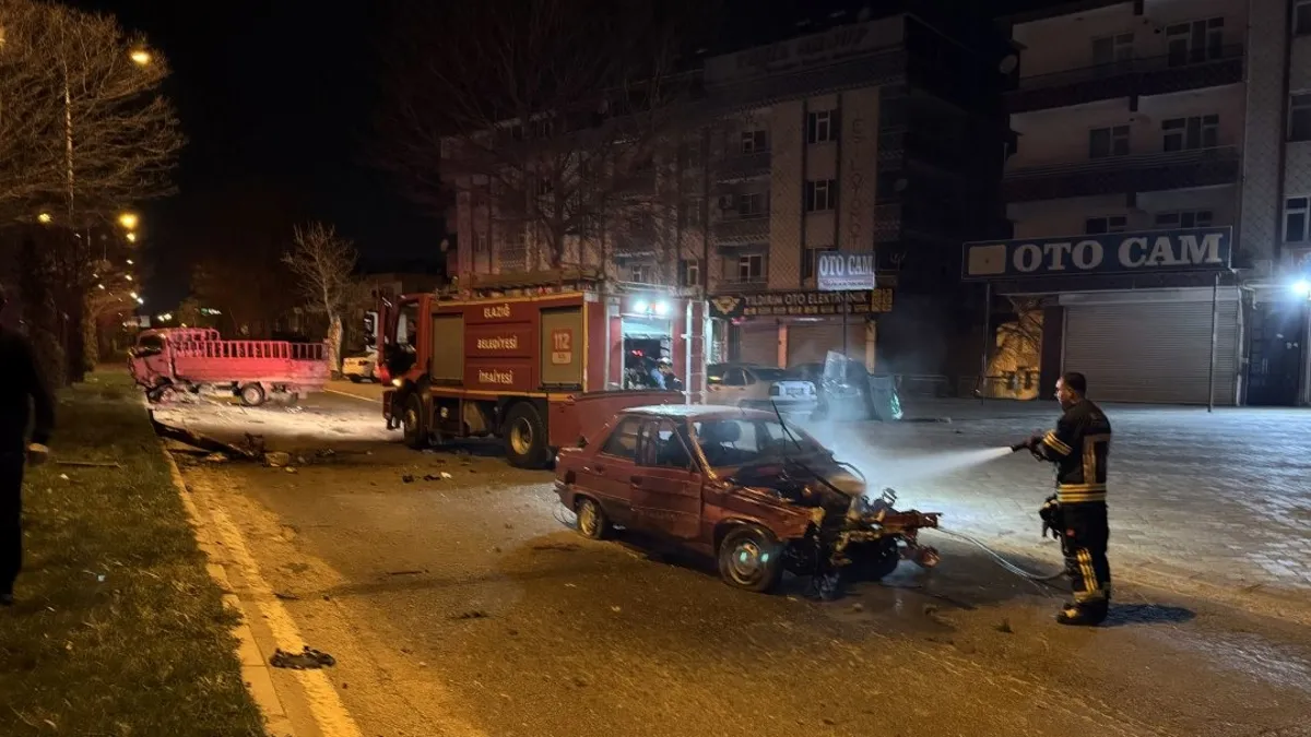 Kaza, Elazığ merkez Cahit Dalokay Caddesi üzerinde meydana geldi. Sürücüleri henüz öğrenilemeyen 23 ACM 547 plakalı otomobil ile 23 AED 505 plakalı kamyonet çarpıştı. Çarpışmanın şiddetiyle otomobilde yangın çıktı.