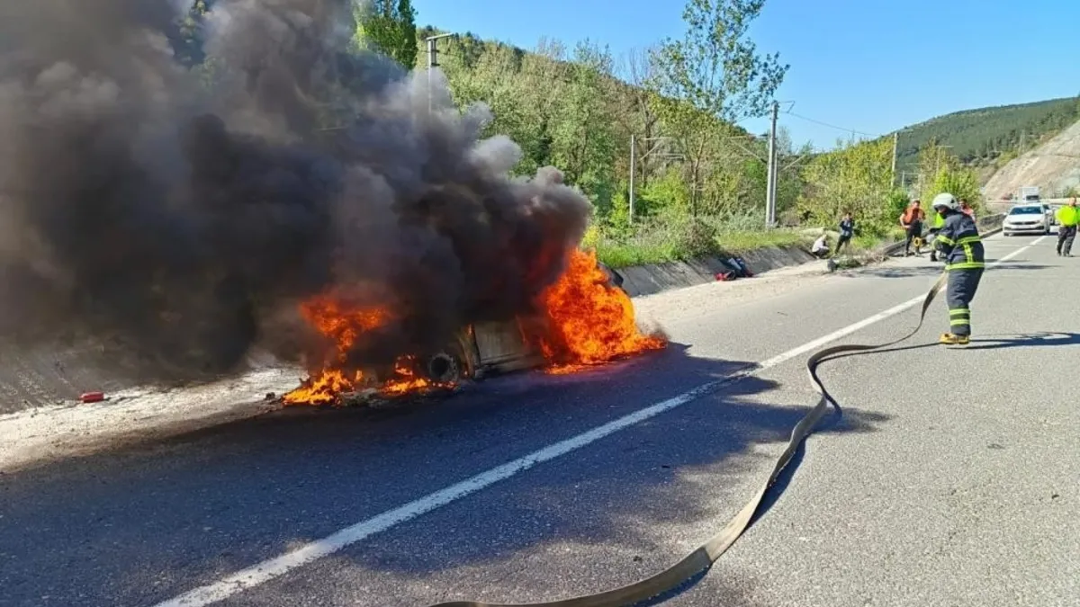 Bilecik'te seyir halinde olan bir araçtan bir anda alevler yükseldi. Yangın otomobili sararken, cayır cayır yanan araç adeta küle döndü. Jandarma olayla ilgili inceleme başlattı.