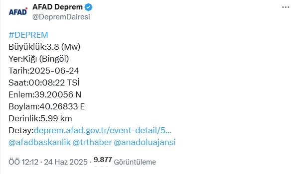 2025-06-24 00:08:22 39.20056 40.26833 5.99 MW 3.8 Kiğı (Bingöl)