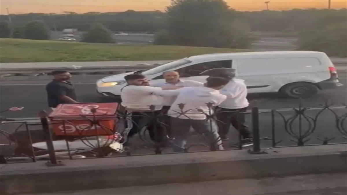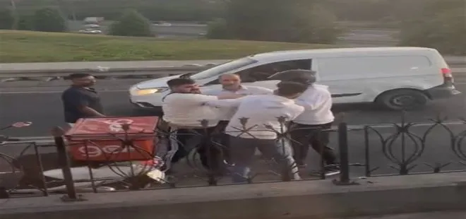 Gaziosmanpaşa'da iki kurye arasında çıkan kavgayı ayırmak isteyen bir vatandaş, taraflara sinirlenerek motokuryelere vurmaya başladı. O anlar çevrede bulunan bir kişi tarafından görüntülendi.