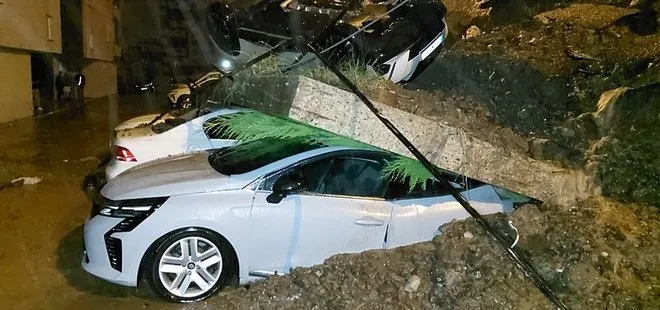 Samsun'da kuvvetli sağanak! İstinat duvarı araçların üzerine devrildi