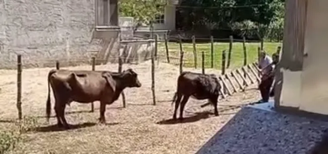 Bursa'da Karacabey ilçesi Kurşunlu Mahallesi'nde meraklı bir inek başını ahşap merdivene sıkıştırdı. Uzun süre merdivenden kurtulmak için çabalayan ineğe sahibi müdahale ederek kurtardı.