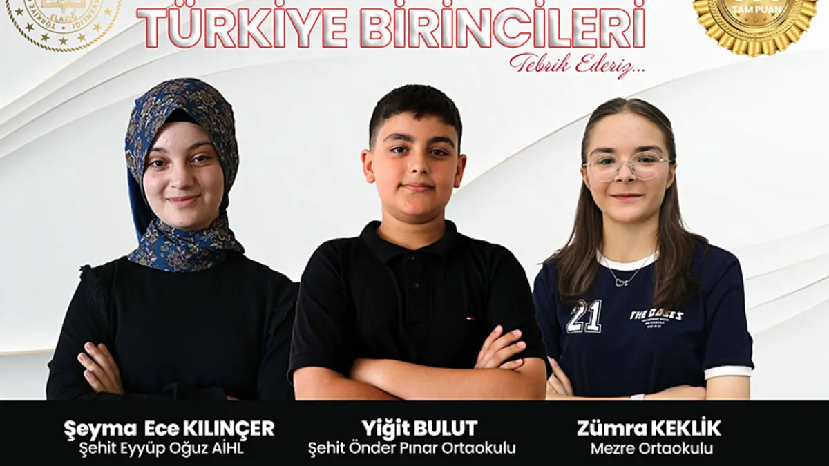 Elazığ'da 3 öğrenci LGS'de 500 tam puan alarak Türkiye birincisi oldu.