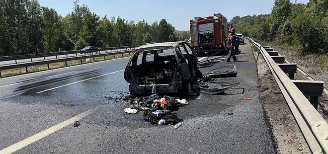 Anadolu Otoyolu Sakarya geçişinde seyir halindeyken alev alev yanan yabancı plakalı otomobilden geriye, demir yığınları kaldı.
