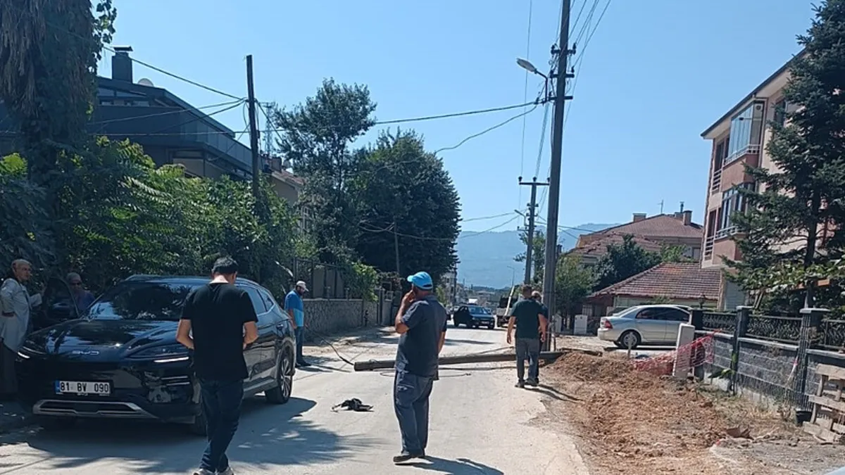 Düzce'de ahşap telefon direği seyir halindeki aracın üzerine devrildi. İçinde ailenin bulunduğu araç hasar alırken, aile büyük şok yaşadı.
