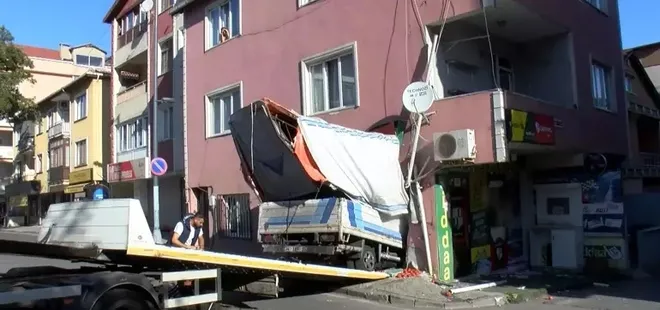 Üsküdar'da iddiaya göre şoförün direksiyon hakimiyetini kaybettiği kamyonet 3 katlı binanın girişinde bulanan iş yerine girdi.
