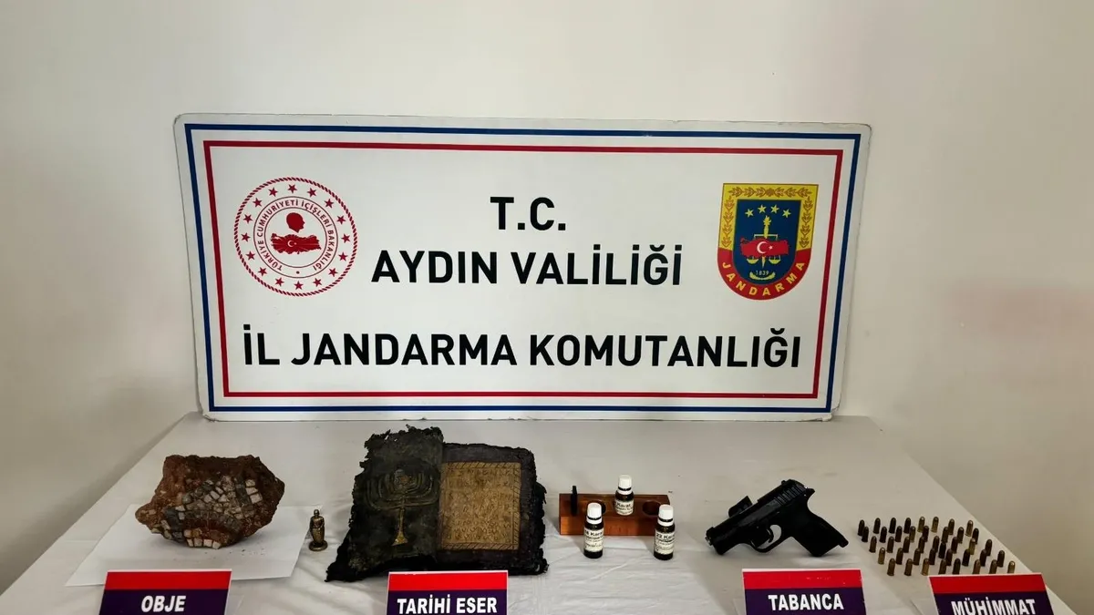 Aydın’da jandarma ekipleri tarafından yapılan tarihi eser operasyonu kapsamında M.E. (50) isimli şüphelinin ikametinde arama gerçekleştirildi. Operasyonda Bizans dönemine ait olduğu değerlendirilen dua kitabı ve tarihi eserler ele geçirildi.