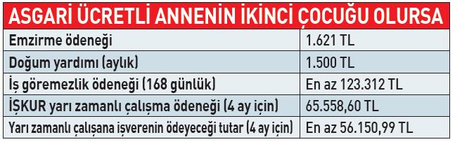 Doğum izni sonrası isteyen anneler birinci çocukta 60, ikinci çocukta 120 ve üçüncü çocukta 180 gün süreyle yarım çalışma yapabiliyor. Çoğul doğumlarda bu sürelere 30 gün ekleniyor. Çocuğun engelli doğması halinde ise 360 gün olarak uygulanıyor. Bu sürelerde işveren anneye yarım maaş öderken, İŞKUR da brüt asgari ücret üzerinden yarım çalışma ödeneği veriyor. İŞKUR yarı zamanlı çalışan anneye her ay için 16 bin 389 lira 65 kuruş ödüyor. İlk doğumunu yaparak 2 ay yarı zamanlı çalışan anne İŞKUR'dan toplam 32 bin 779 lira 30 kuruş alıyor.