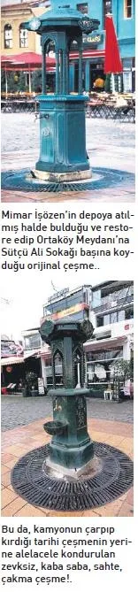 Ortaköy Meydanı'nın açılışında halkın ilgisini gören o zarif, antik ve tarihi çeşmenin yerini, bir döküm firması tarafından taklit olarak üretilmiş; oranları uyumsuz, üzerindeki tuğrası taklit, kemerli süslemeli alnı değiştirilmiş çakma çeşme aldı.