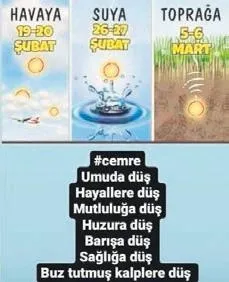 Geçen hafta sonu birinci cemre, havaya düştü.. Çocukken Bandırma'da cemreler düşmeye başladı mı, bayram yapardık. Cemre havaların ısınmaya başlaması demekti. Önce havaya, sonra suya, en son toprağa düşerdi, birer hafta ara ile..