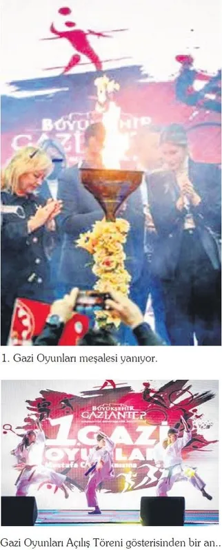 1. Gazi Oyunları'na 15 ayrı branşta ve 15 ayrı spor tesisinde, katılacak 7626 okullu sporcuyu temsilen, okul ve kulüp flamaları ve Türk bayrakları ile açılışa katılan gençler, Şahin Bey Spor Salonu'ndaki törende. Şahin, Antep'in kurtuluşunda ve "Gazi" unvanı almasında başrolü oynayan, küçücük gönüllü gurubu ile Fransız kuvvetlerinin yolunu kesen kahramandır ki, adına düzenlenen destan ve şehadeti üzerine ağıtları, çocukluğumun geçtiği Kilis'te ezberlemiştim. O eski ağıt "Uyan Şahan uyan, bak neler oldu / Sevdiğin Antebe düşmanlar doldu" derdi. Bugün Şahan'ın sevdiği Antep'te işte böyle, gençlerin "Zafer Oyunları" var!.