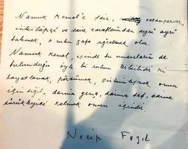 Birisi, Necip Fazıl Kısakürek'in kendi el yazısı ile Namık Kemal'i anlattığı satırlar..