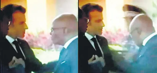 Bakansa, Macron'un eliyle dokunduğu yeri anında parmak uçlarıyla temizleyerek silkeliyor. Ürkek de olsa ters bakışı da gözlerden kaçmıyor.